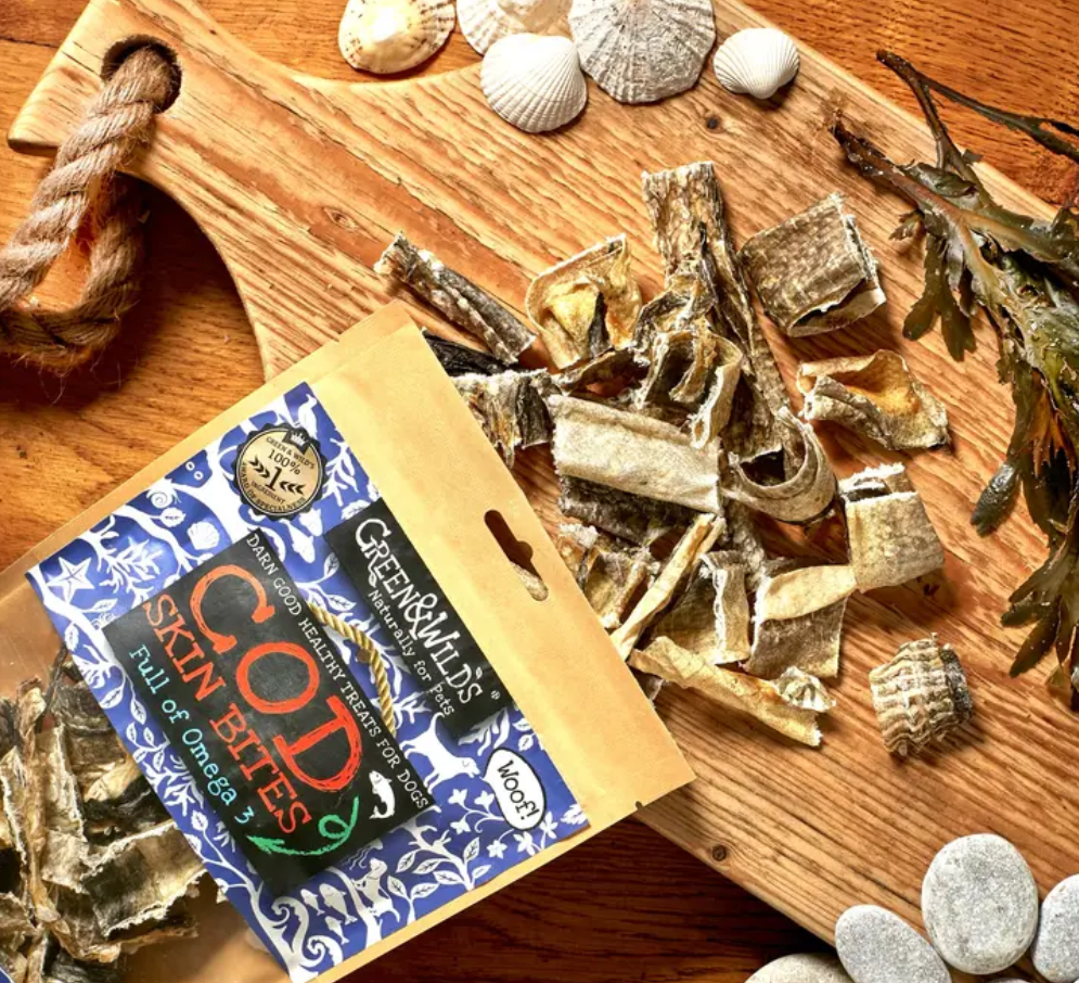 100% Natural Cod Skins. These small Cod Skin Bites are air-dried to hold in all that fishy goodness!
