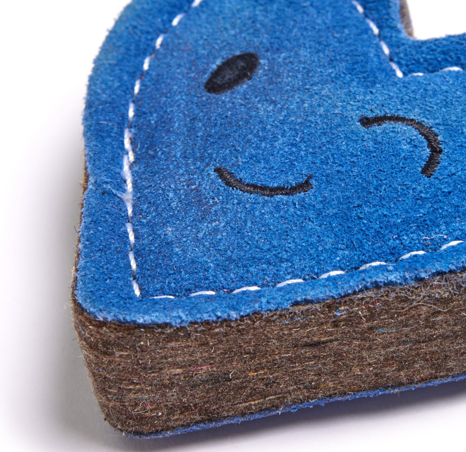 The suede is a by-product and ensures that this material is not wasted. Tough and long-lasting, made without using any compound that would harm or be released when chewed. Wool felt is 100% biodegradable.