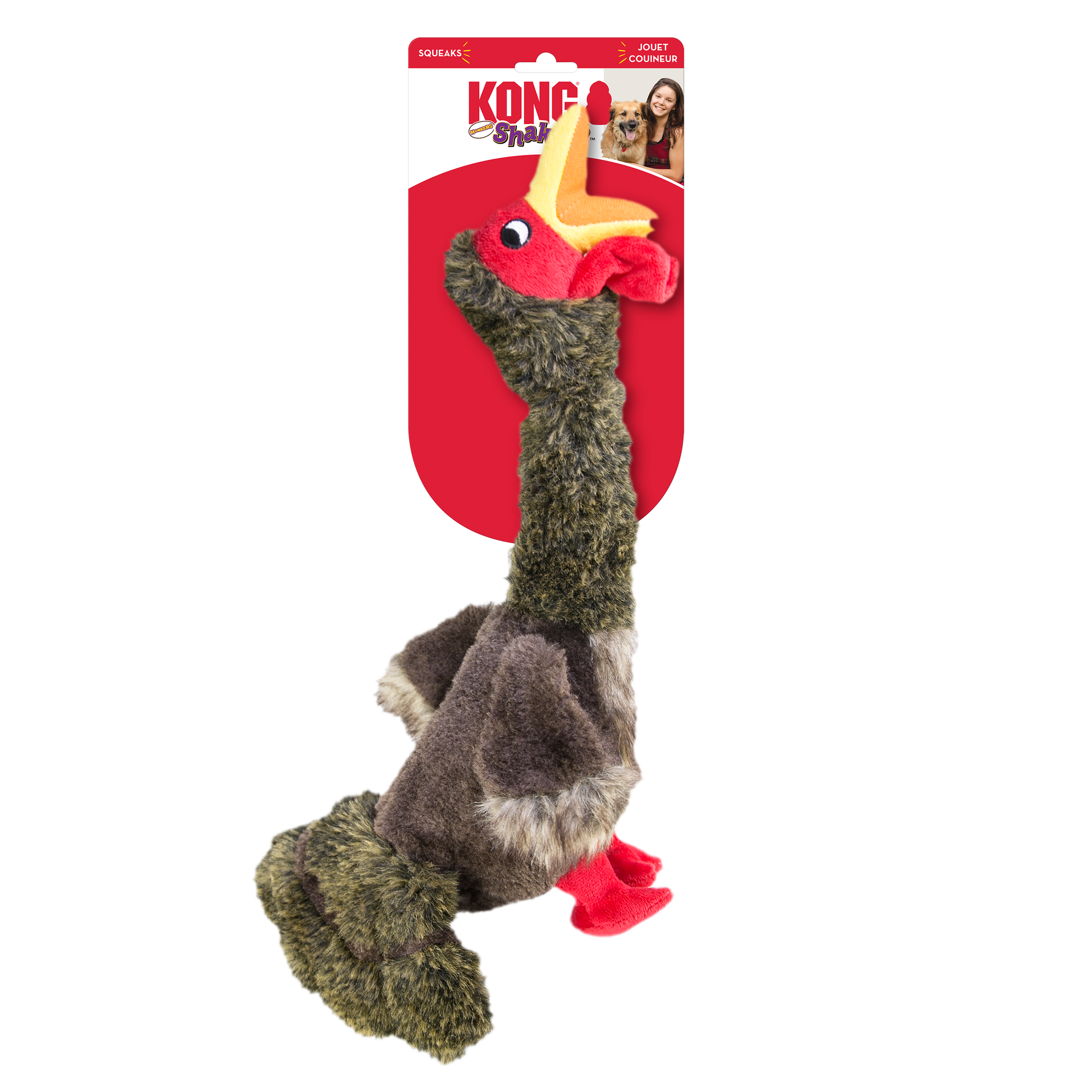 KONG Shakers Honkers let the fun fly with an internal neck features a texture that satisfies a dogs’ natural chewing instincts while the long floppy legs spark shaking and tugging playtime fun. The KONG Shakers Honkers low tone squawk and the reinforced plush design keeps dogs tickled pink and playing longer.