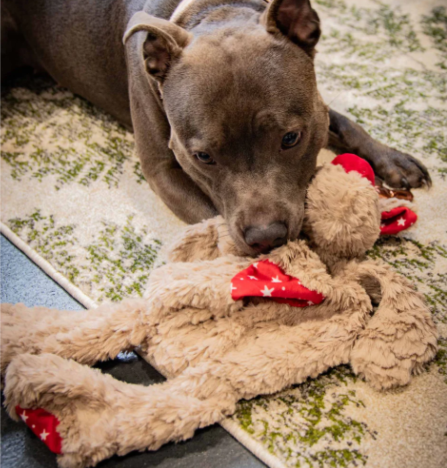 With a stuffing-free design, Rita offers soft, safe snuggles and gentle play, perfect for your pup. Infused with calming lavender, she helps ease anxiety and brings festive cheer.